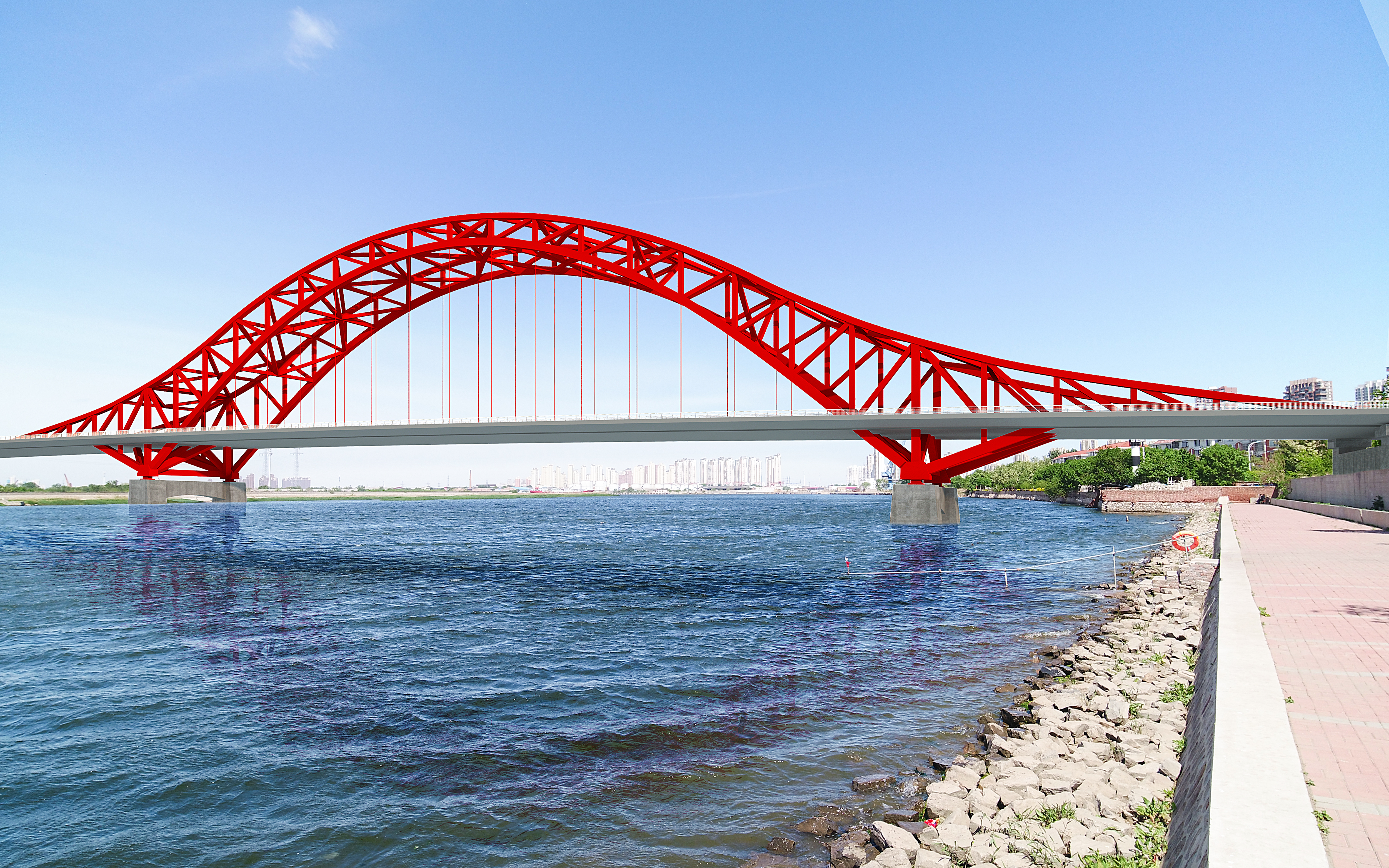 該項目位于天津市濱海新區,南起海河南岸曙光道,北與車站北路跨鐵路橋順接,主橋為一座72m+216m+72m三跨連續中承式鋼桁架系桿拱橋,主拱矢高48m,路線總長度約2.1km,主線設計速度50km/h,為雙向6車道城市主干路,設置跨海河特大橋和上海道互通立交各一座。項目將采用拱上吊機半懸臂拼裝工藝,鋼結構的連接方式整體吊裝全焊接施工,橋面鋪裝采用環氧瀝青混凝土,南側引橋采用預制墩柱+預制蓋梁+預制小箱梁的全裝配結構形式。項目建成后,成為“多橋+隧道”布局的重要一環,有效緩解“濱城”核心區內部跨海河通道壓力,提升城市交通承載力。該項目作為二局承接的國內首個單孔跨度超200米的橋梁工程,實現了公司涉水橋梁領域新突破。